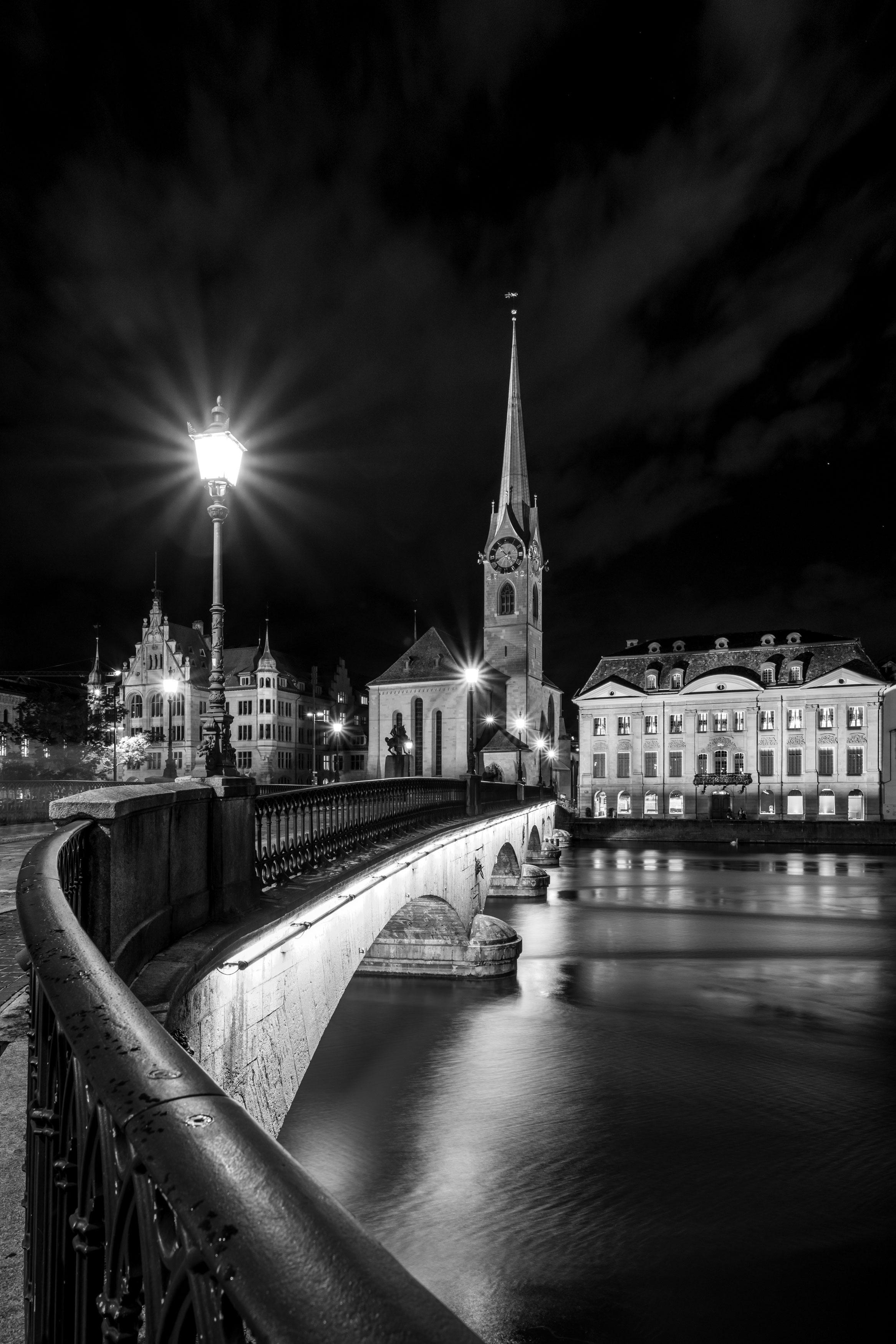 Nehmen Sie Ihre Kamera und Ihr Stativ mit auf einen abendlichen Fotospaziergang durch die Stadt: Denn treffen helle Stadtlichter auf die Dunkelheit der Nacht, finden sich starke Schwarzweißmotive.