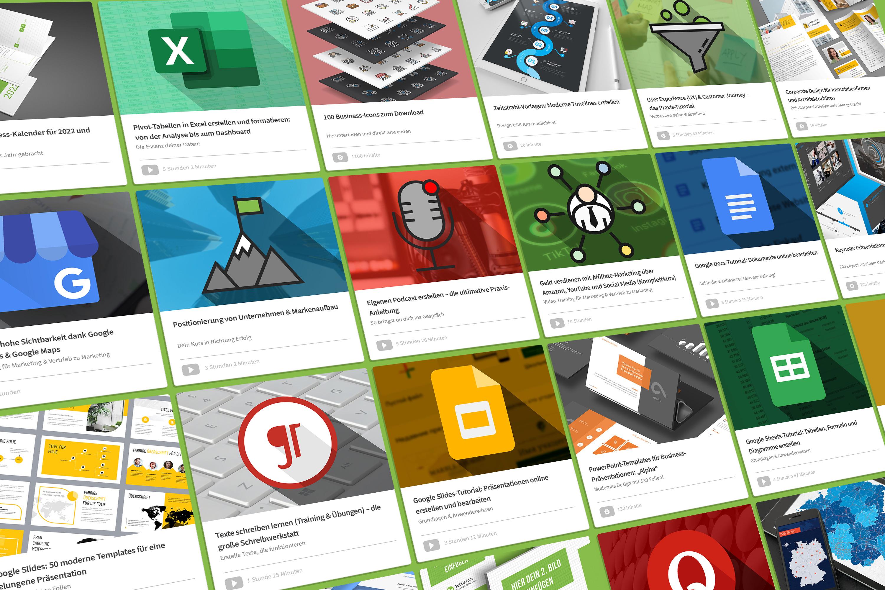 Die Schulungen von TutKit.com decken hauptsächlich die Themen Marketing und Vertrieb sowie Büro und New Work ab. Programme wie Photoshop, InDesign und Acrobat werden von Experten ihres Fachs ebenso behandelt wie Excel, Word, PowerPoint, Outlook und Google Sheets. Gleichwertig werden Tutorials zu digitalen und geschäftlichen Aspekten hervorgehoben.